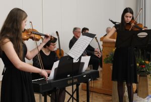 Das Violinensemble quattro corde in der Besetzung Tina-Marie Hübel, Sabrina Fierescu und Felix Wagner musizierte mit ihrer Lehrerin, Klaudia Piecha bei zwei Festakten. Auf dem Programm standen Evergreens der Filmmusik: ein Medley aus Der Herr der Ringe und die Titelmelodie aus Der Zauberer von Oz. Entschlossen und schwungvoll aber auch nachdenklich und sehnsüchtig präsentierten sich die jungen Musiker den versammelten Schülern und Gästen.
